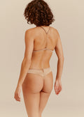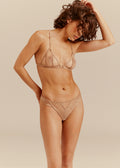Bold and sensual string, enhanced with golden jewelry, combining Leavers lace from Calais, silk satin, and invisible second-skin effect tulle. The satin back, adorned with golden ring details, features seamless finishes for perfect discretion.