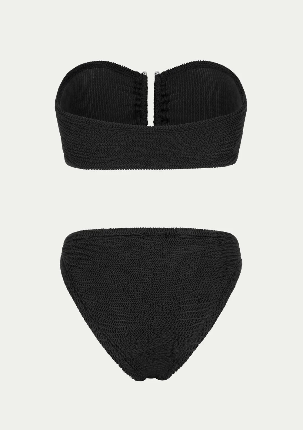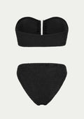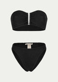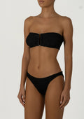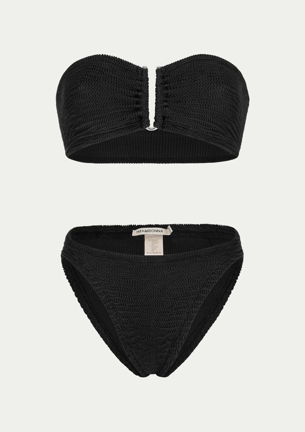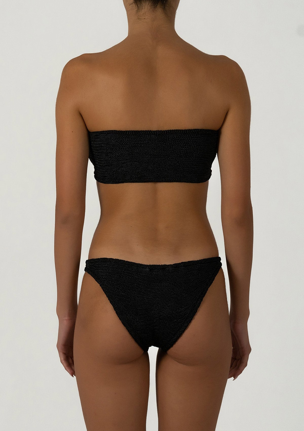 Two piece bikini Frida in black color. This model fits through sizes from XS to 2XL. The top represents a classic bandeau bikini style featuring a hook accent at the front and a delicate cut. The bikini bottom is low waisted. To maintain the swimsuit’s high elasticity and bright color, please hand wash it with soap and warm water. Do not tumble-dry, only air-dry.