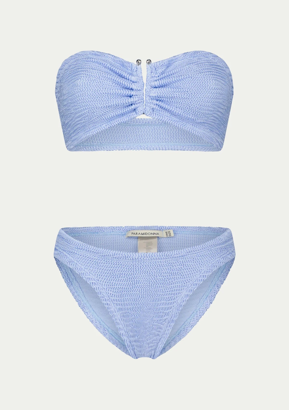 Two-piece FRIDA LAVENDER swimsuit by PARAMIDONNA. The one size model is designed to flatter sizes from XS to 2XL. The strapless bustier top features a stylish cut-out in the middle, accentuated by a metallic accessory, while the moderate cut, low-waisted bikini bottom ensures a comfortable fit. This swimsuit is perfect for achieving an even tan. FRIDA's adaptable design suits women of all bust sizes, ensuring a great fit every time.