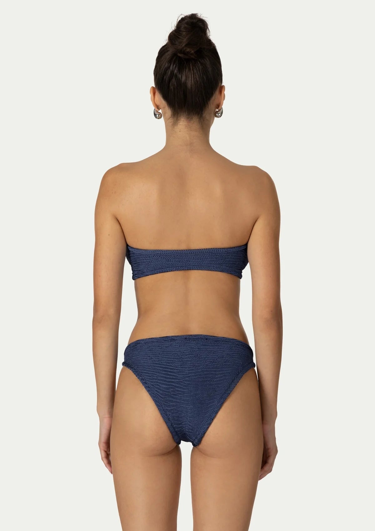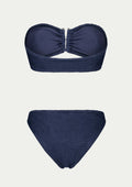 Two-piece swimsuit set FRIDA by PARAMIDONNA. The model is one-size and covers sizes from XS to 2XL. The top is a strapless bustier with a cut-out in the middle, completed by a metal accessory, while the bikini is mid-cut and low-waisted. The swimsuit allows for the collection of an even tan and highlights a great sun tan. The FRIDA half swimsuit is great for women of all chest sizes, always fits great and brings a fresh vibe.