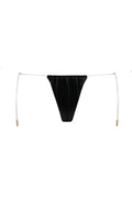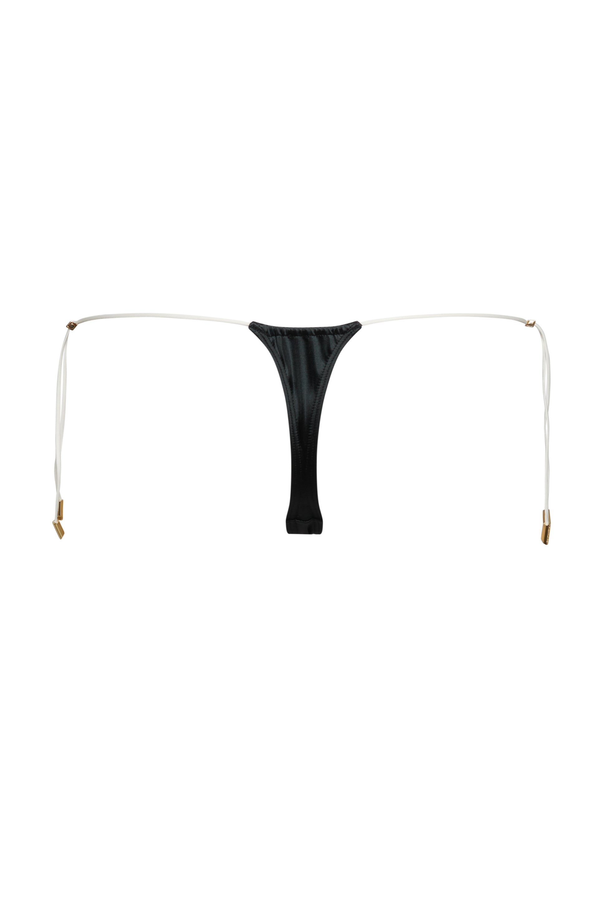 Mini string bikini bottom combining satin-like softness with an iconic, must-have silhouette. Gently pleated at the front and back, this piece offers an elegantly flattering fit. The lace-up sides are adjustable thanks to a unique slider and Maison Close’s signature gold lipstick accessories, allowing you to tailor the look to your desires.