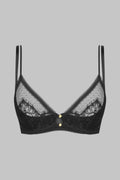 The desire to spellbind is revealed beneath the most exquisitely crafted baroque lace paired with a sophisticated Swiss dot motif. The spiritual is bound to the body through the form of a strap embellished with a golden cross.