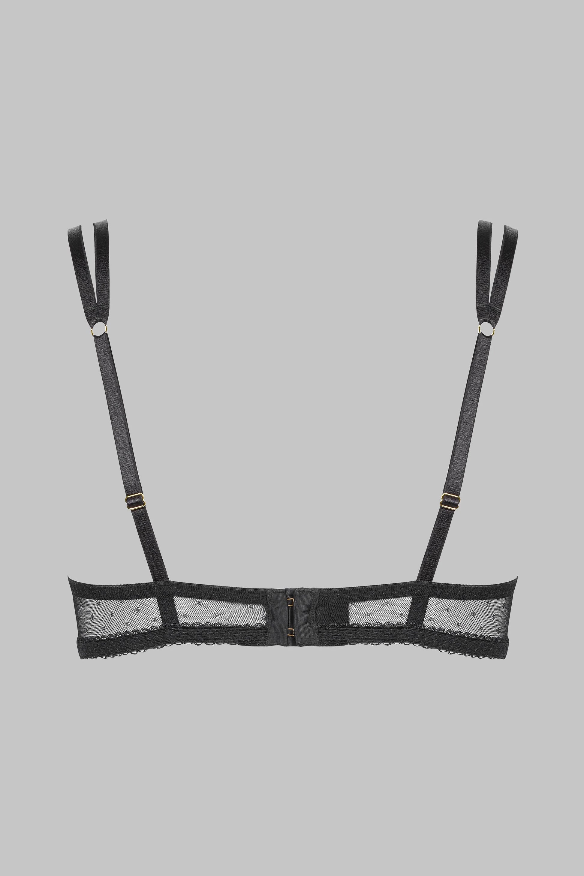 ¼ cup bra teaming Gothic lace in front and Swiss dot mesh. With underwiring and padded cups plus adjustable double spaghetti straps. Unbuttons in front for a cupless effect, adjusts with hook-and-eye fastening at the back.