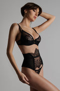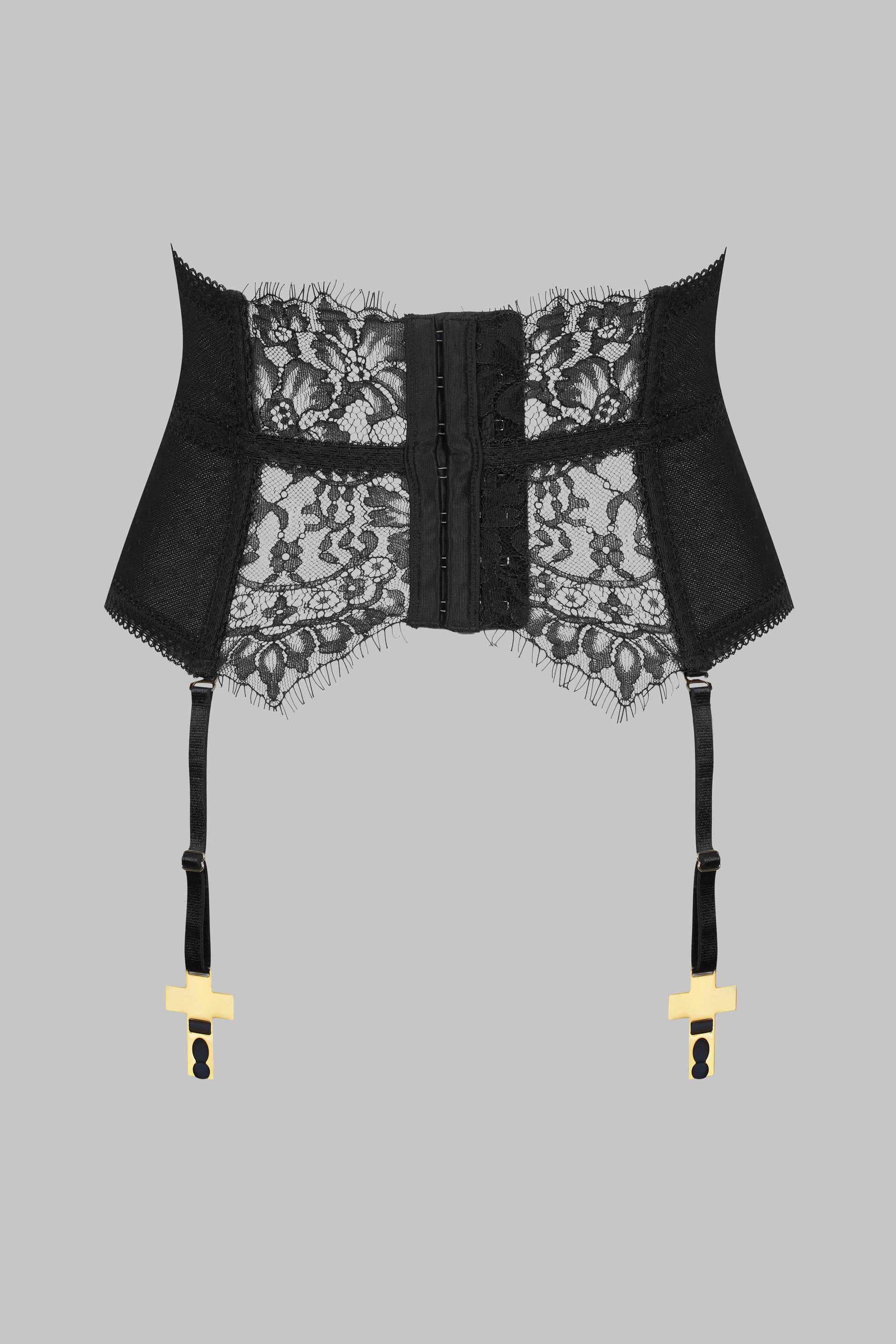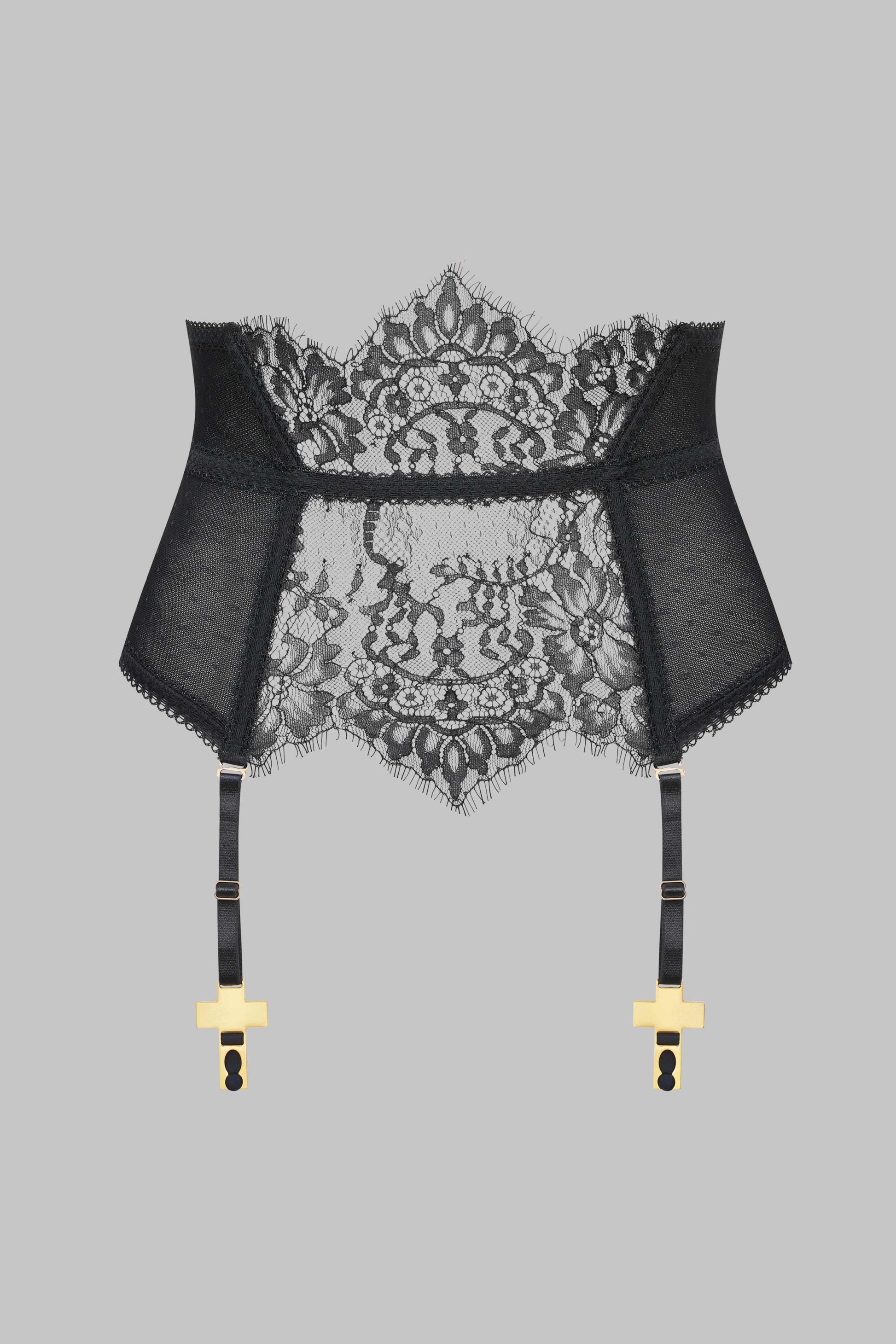 Waspie with suspenders to team a stiff Gothic eyelash lace with a stretchy mesh Swiss dot mesh that is lined at the sides. Supports and structures the waist with soft boning and elasticated picot trim seams. Adjustable hook-and-eye fastening on the back. Trimmed with 4 suspender straps with adjustable, detachable extenders with gold crosses. A haunting piece of lingerie that is iconic of the Inspiration Divine collection.