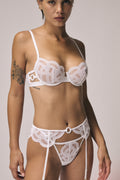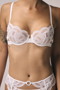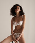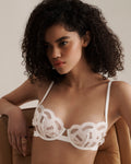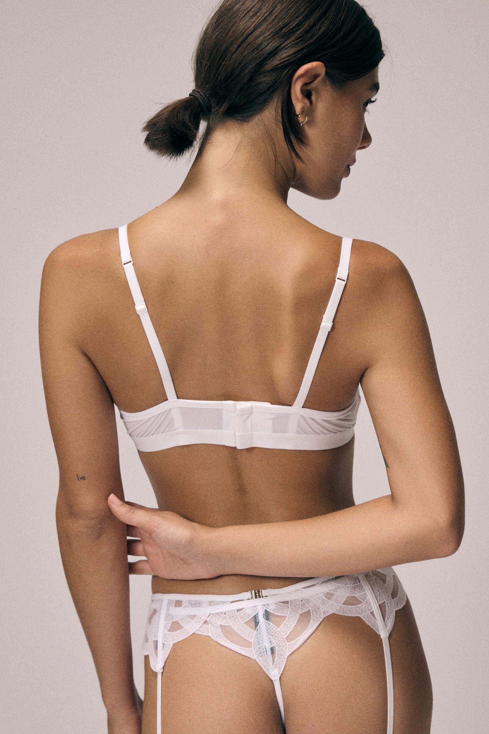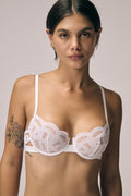 A modern, graphic bra, a signature style from the Paris collection. Featuring feminine embroidery, covered rings, a stretch microfiber back, a bust-enhancing balcony, and stretchy, adjustable straps.