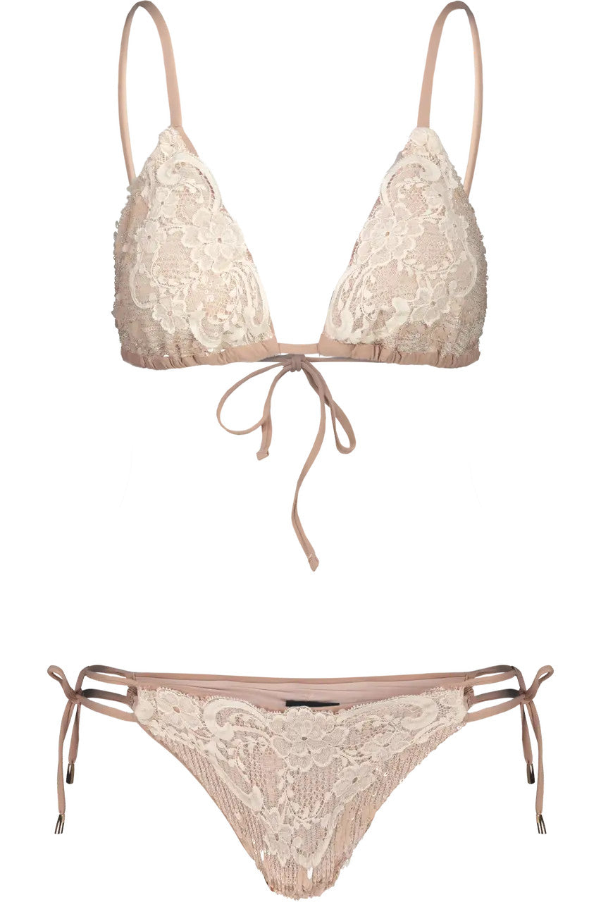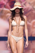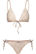 A refined model that combines craftsmanship and modernity, designed to enhance femininity with balance and style. The triangle top, with removable padding, decorated with delicate Chantilly lace embroidery and iridescent sequins, reflects the light with sophisticated nuances, creating a precious yet never overbearing effect. The Brazilian bottom with adjustable ties at the sides harmoniously completes the look, offering a comfortable and personalized fit.