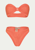 LUCY Two-Piece Swimsuit by PARAMIDONNA. Designed as a one-size style to fit XS to 2XL, LUCY is made from ultra-stretchable, high-quality fabric that adapts seamlessly to different body shapes for a comfortable and secure fit. The top is a bandeau style featuring a soft, gathered bow detail at the center, which gently accentuates the bust while maintaining support and ease. A beautiful choice for women of all bust sizes, including fuller or natural busts. The bikini bottom has a mid-rise fit with cheeky coverage, flattering your curves while staying comfortable all day. LUCY brings comfort, confidence, and timeless style to every sun-soaked day.