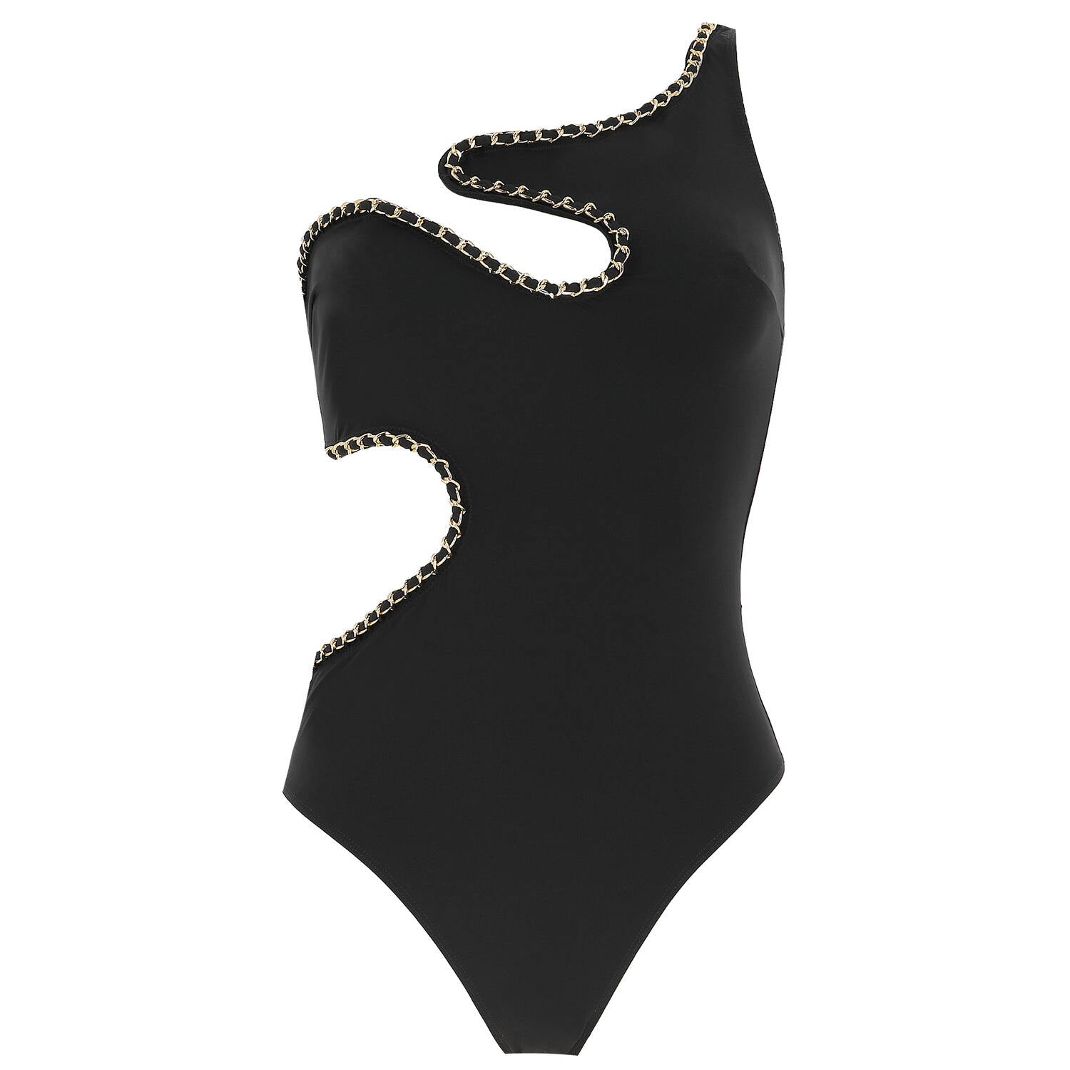 Asymmetrical one-piece swimsuit. The neckline and wavy cut are connected by a braided gold chain, a LIVY signature detail. Shaping microfiber sculpts the silhouette for a confident look. Can be worn as swimwear or as a bodysuit under a blazer.